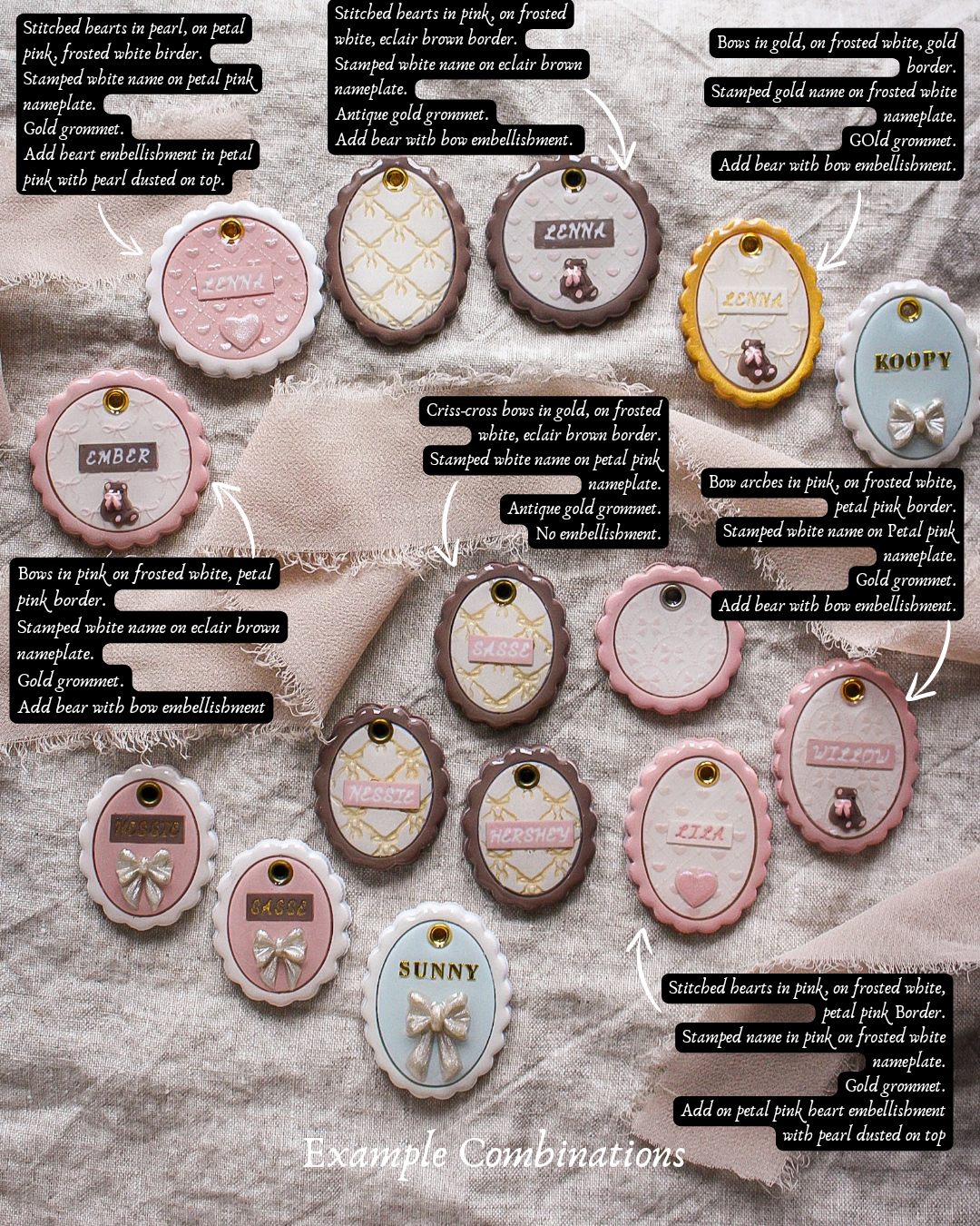 Please allow for small imperfections and differences in the tags as they are handmade. They will not compromise the integrity of the tag. The tags are water resistant, NOT water proof and may show wear over time and heavy use. They are also NOT chew proof, so please supervise your pet while the tag is in use.
